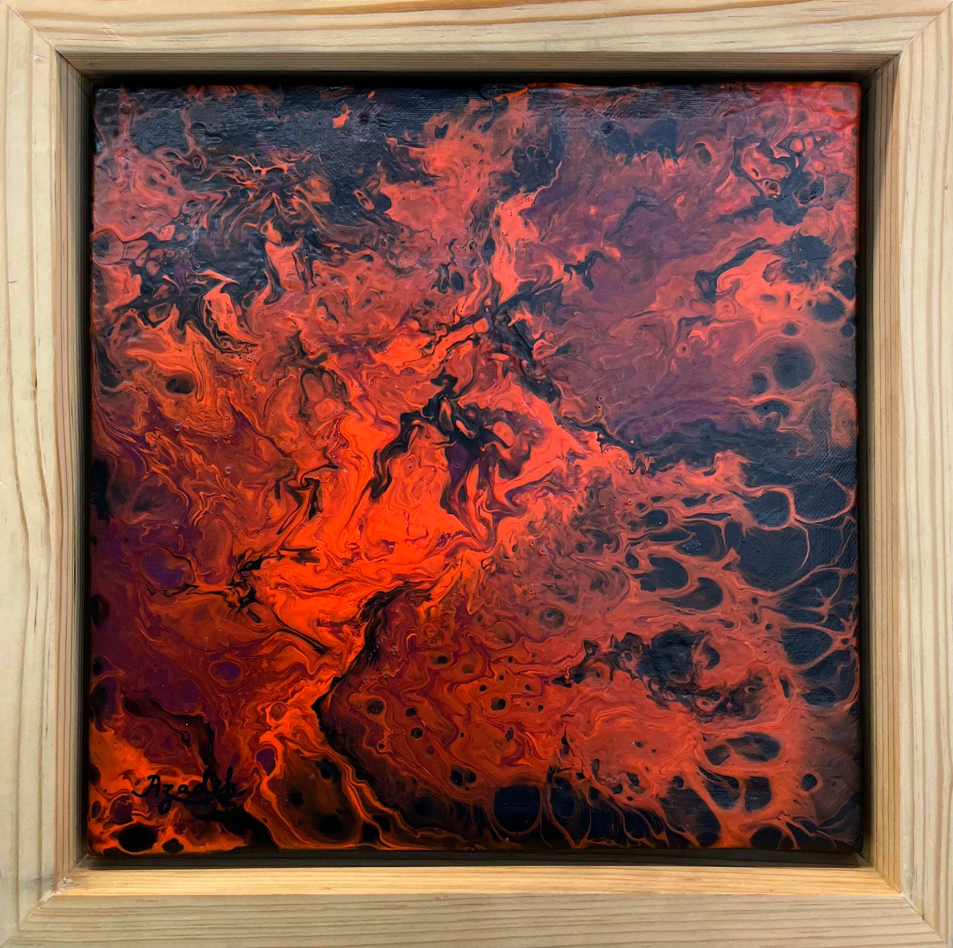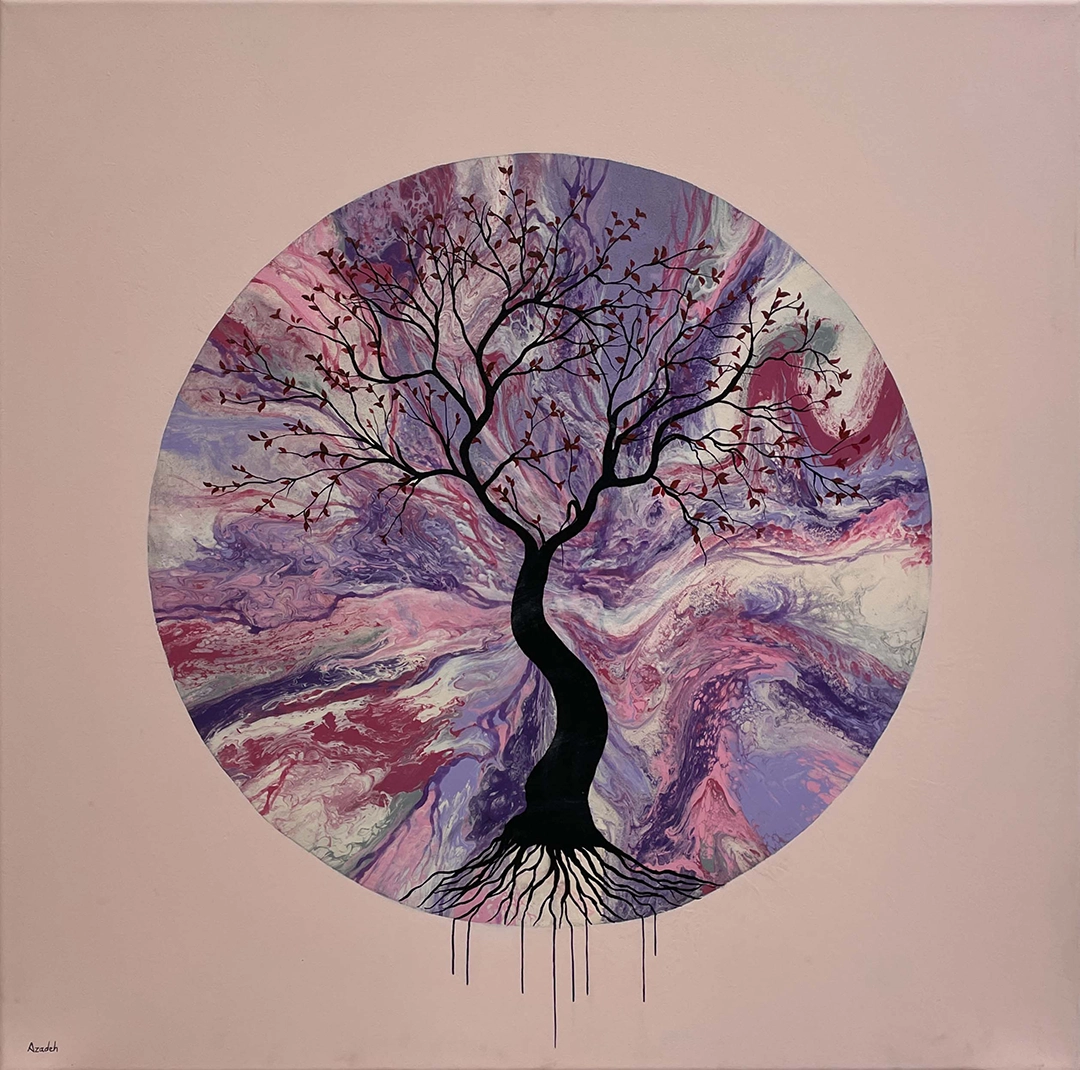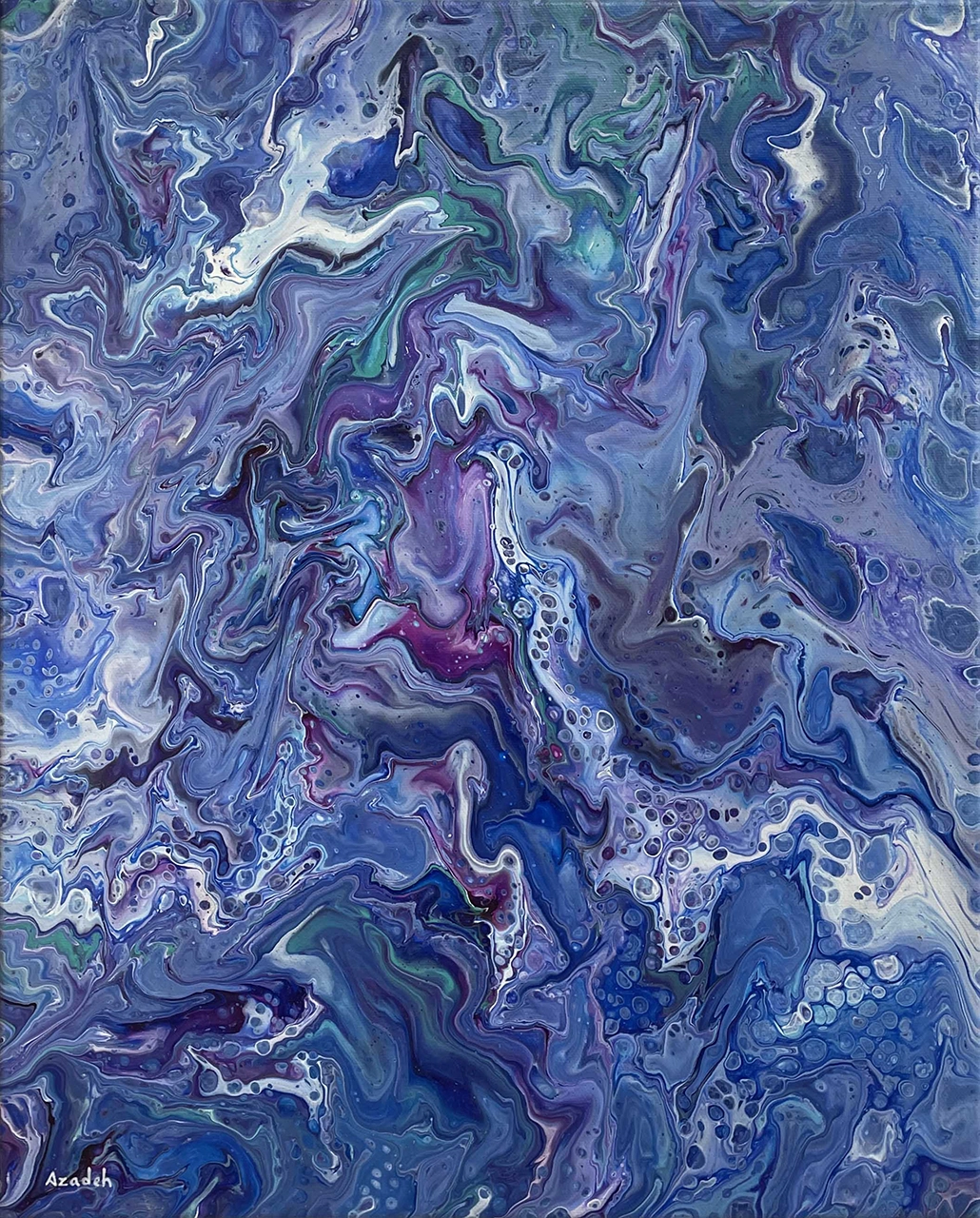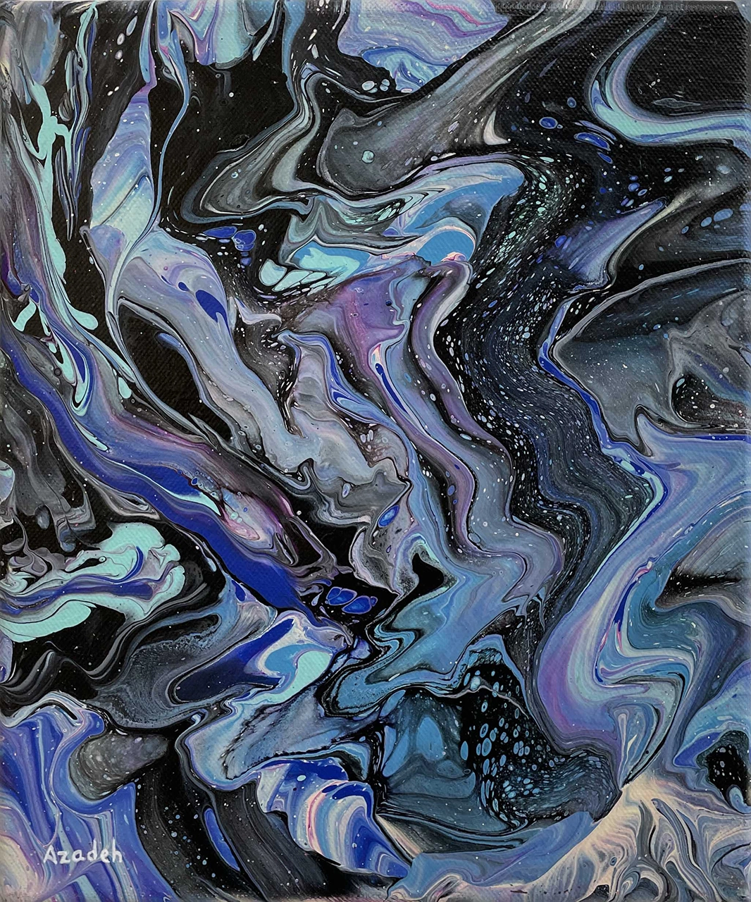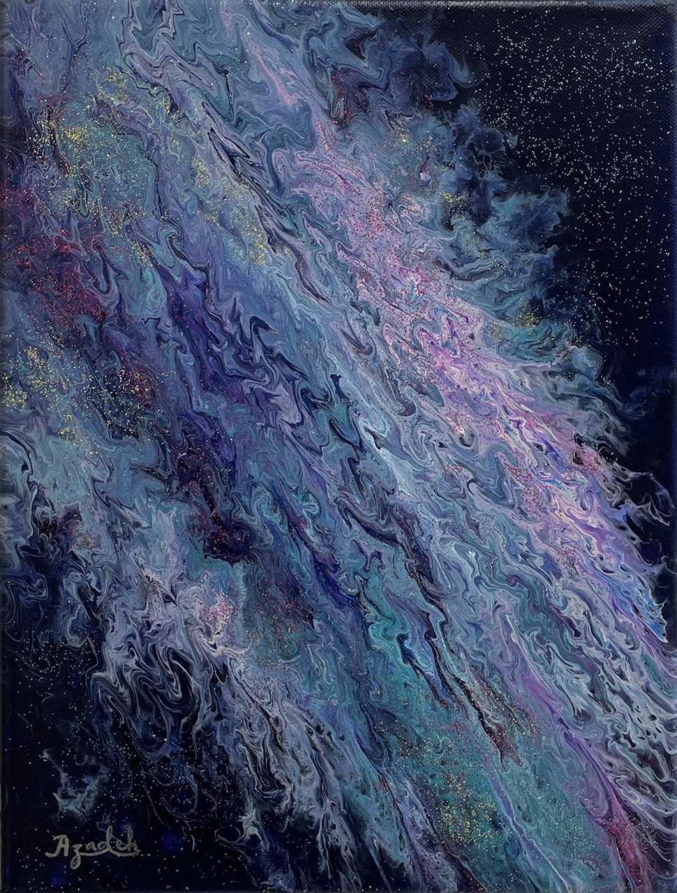 Exploradora activa del arte fluido, Azadeh Shamsaei se inspira en la energía del cosmos para crear ríos de colores que corren y se expanden de forma aleatoria sobre el lienzo, evocando formas únicas, llenas de movimiento.