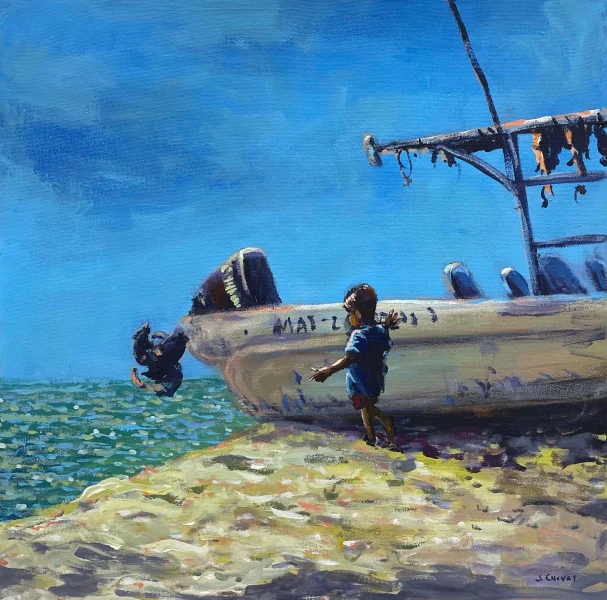 Jesús Cuevas transmite sus emociones a través de las manos, pintando directamente con los dedos en el lienzo. Su obra se basa en el impresionismo, por ello volvió a Oaxaca tras estudiar arte en la Universidad Estatal de California, en Fresno: para trabajar con la luz, que tanto le gusta de su estado natal.
