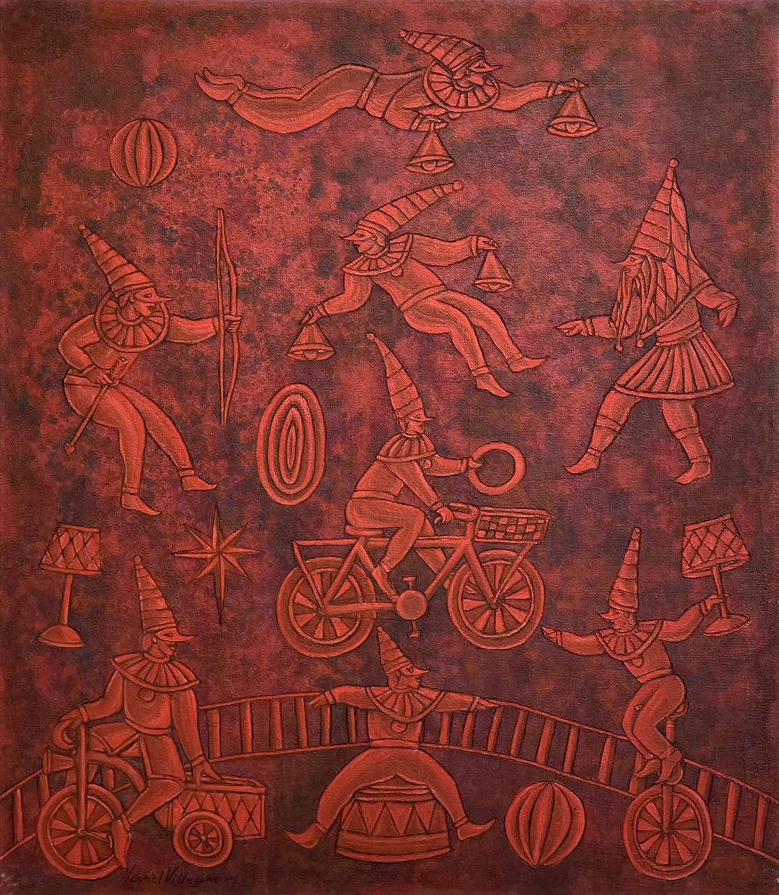 Leonel Villegas genera su obra artística a partir de la memoria colectiva en la que reinterpreta un pasado significativo e histórico. Óleos, acrílicos, pigmentos, tierras y arenas son materiales a los que recurre en sus lienzos para construir escenas, personajes, iconos y símbolos envueltos en manchas y texturas, que lo transportan a diferentes experiencias estéticas.