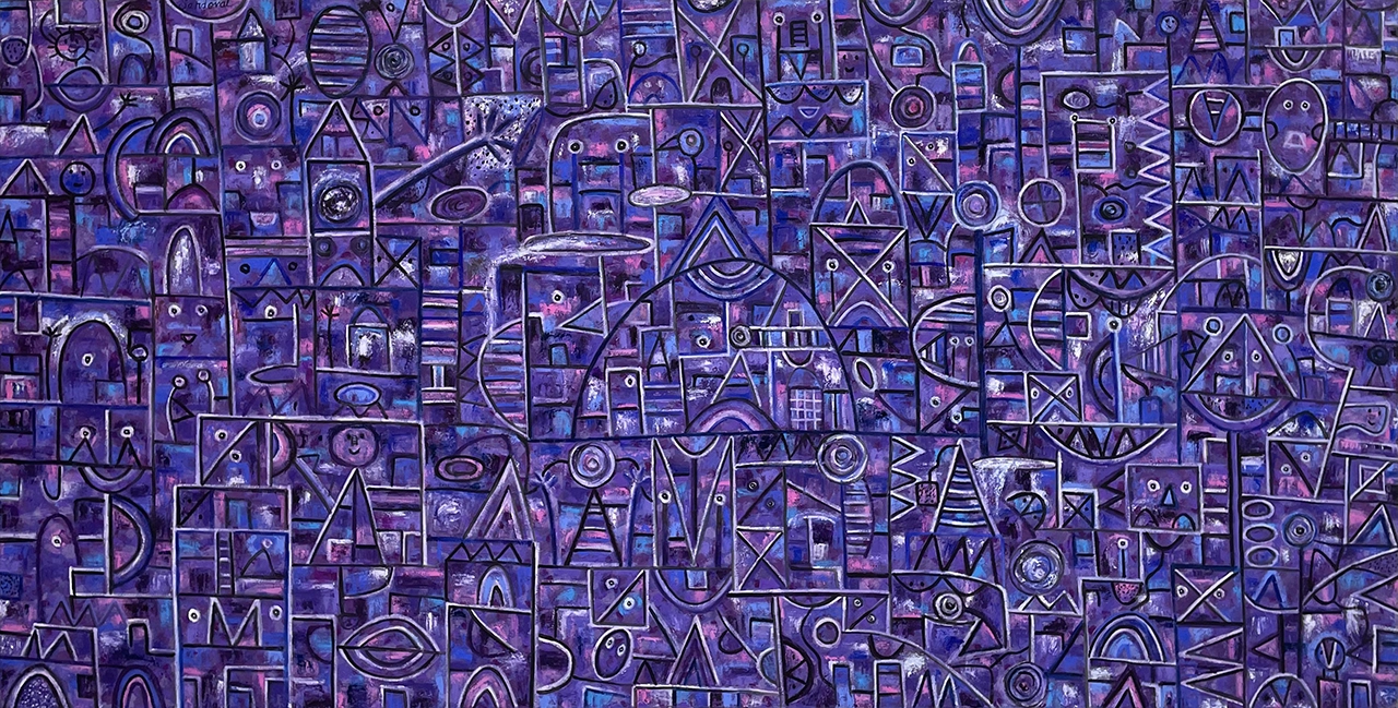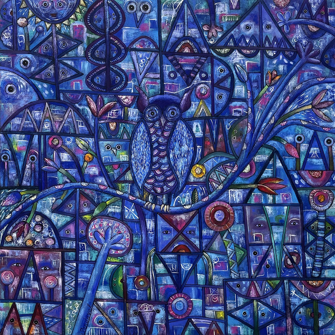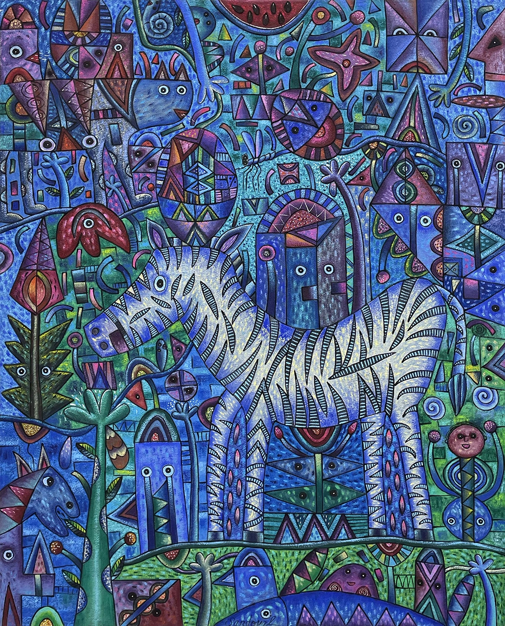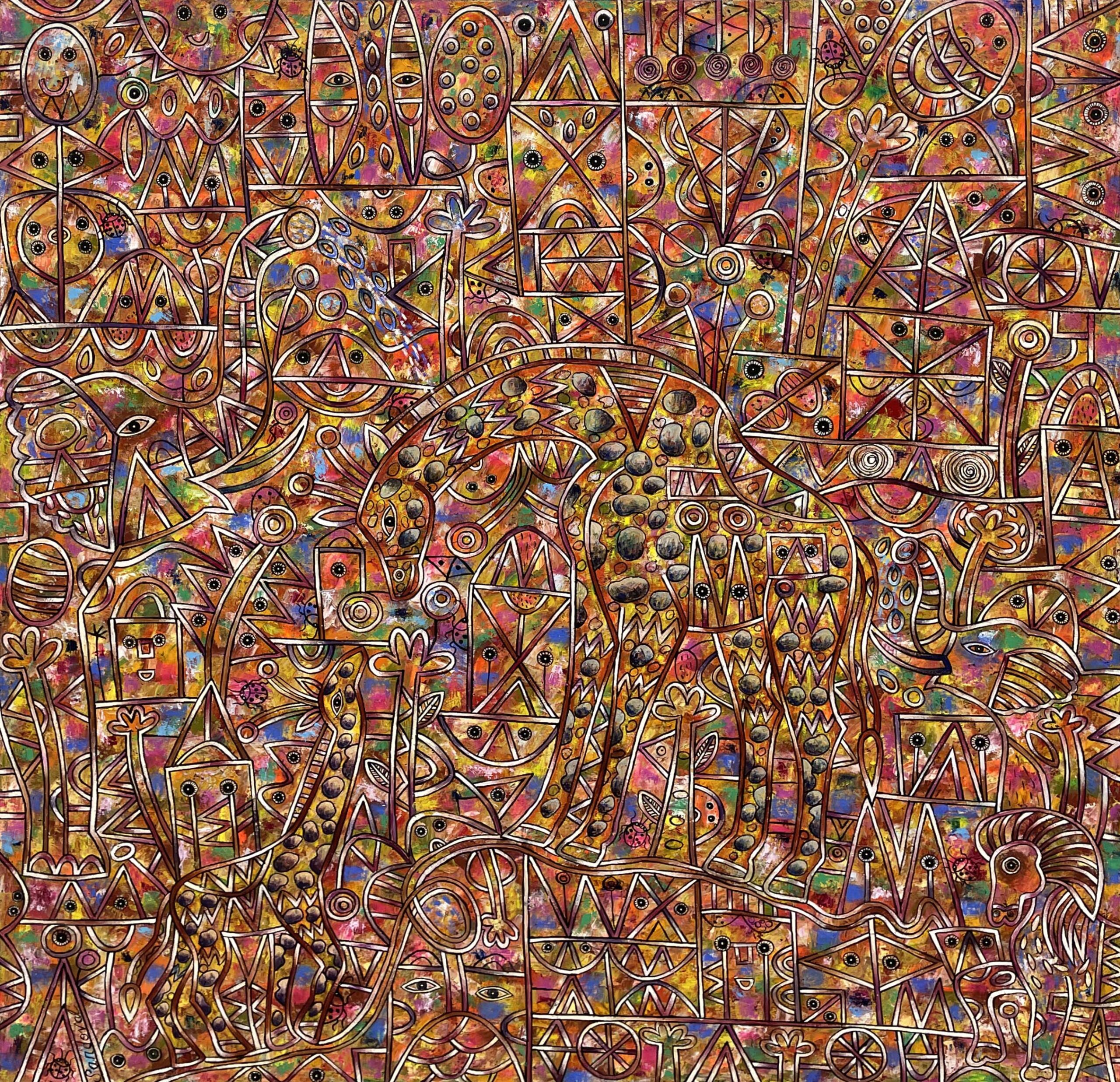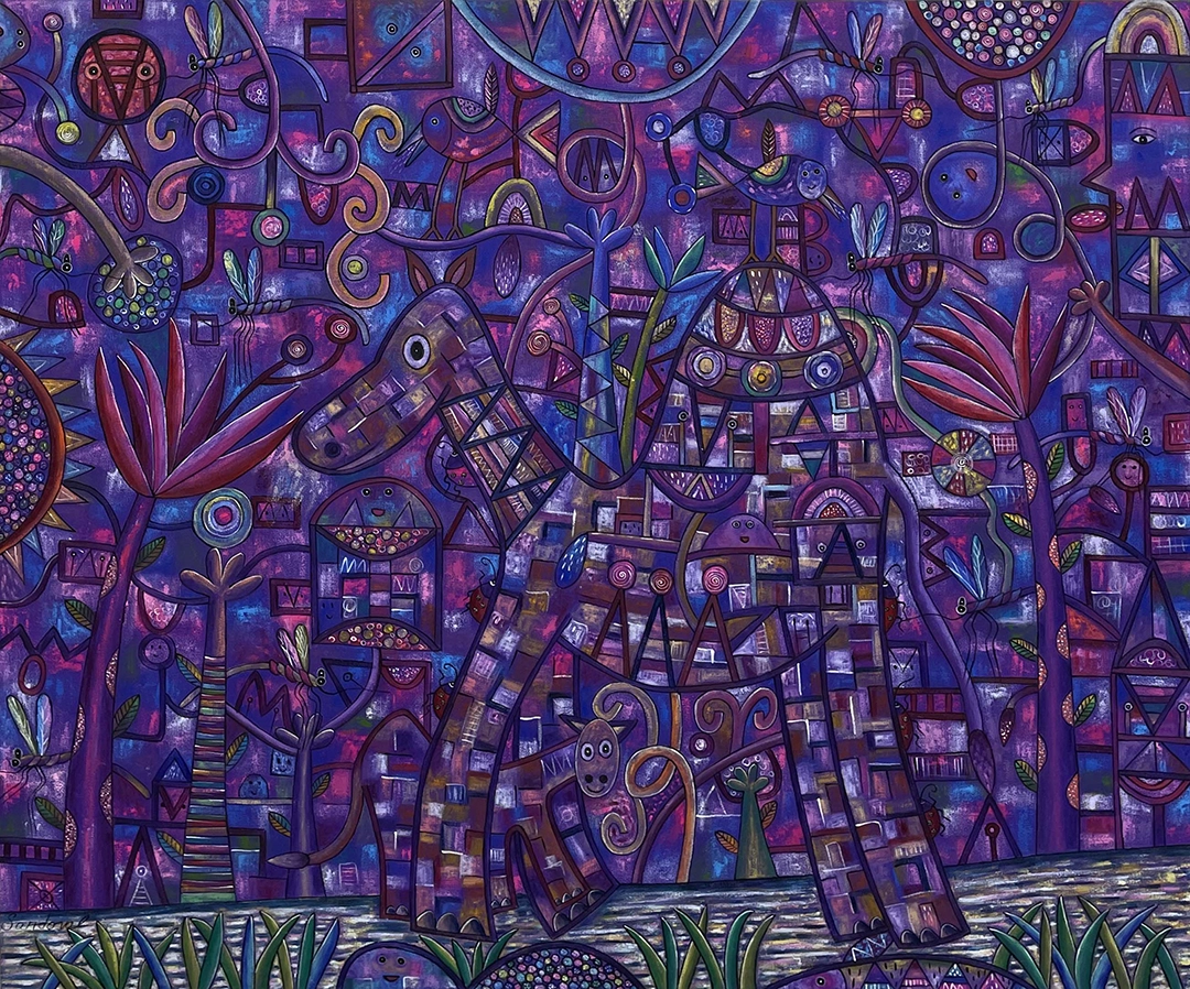 Mediante caminos intrincados, líneas curvas y rectas llenas de color, emergen seres fantásticos que llenan de alegres notas la composición. Cada pincelada es un acento más en su obra.