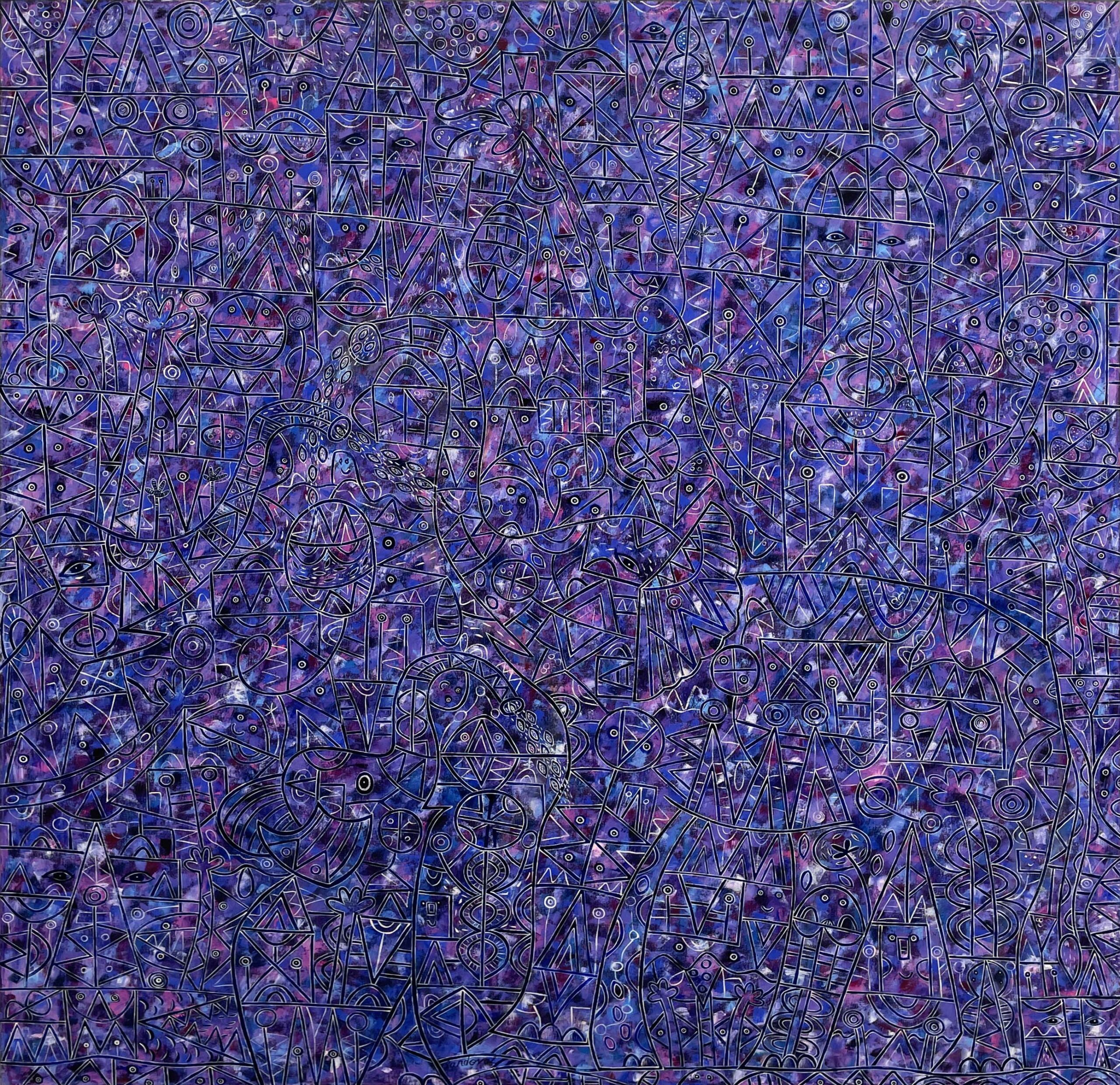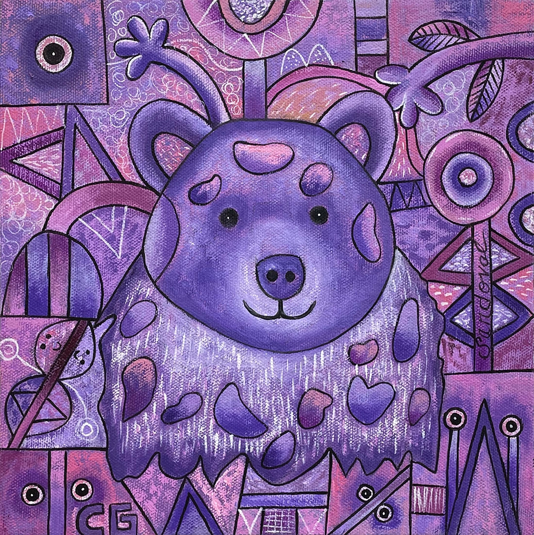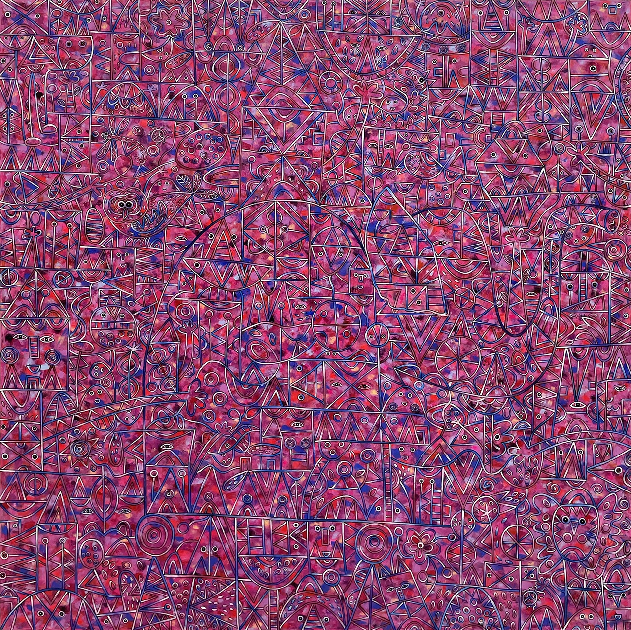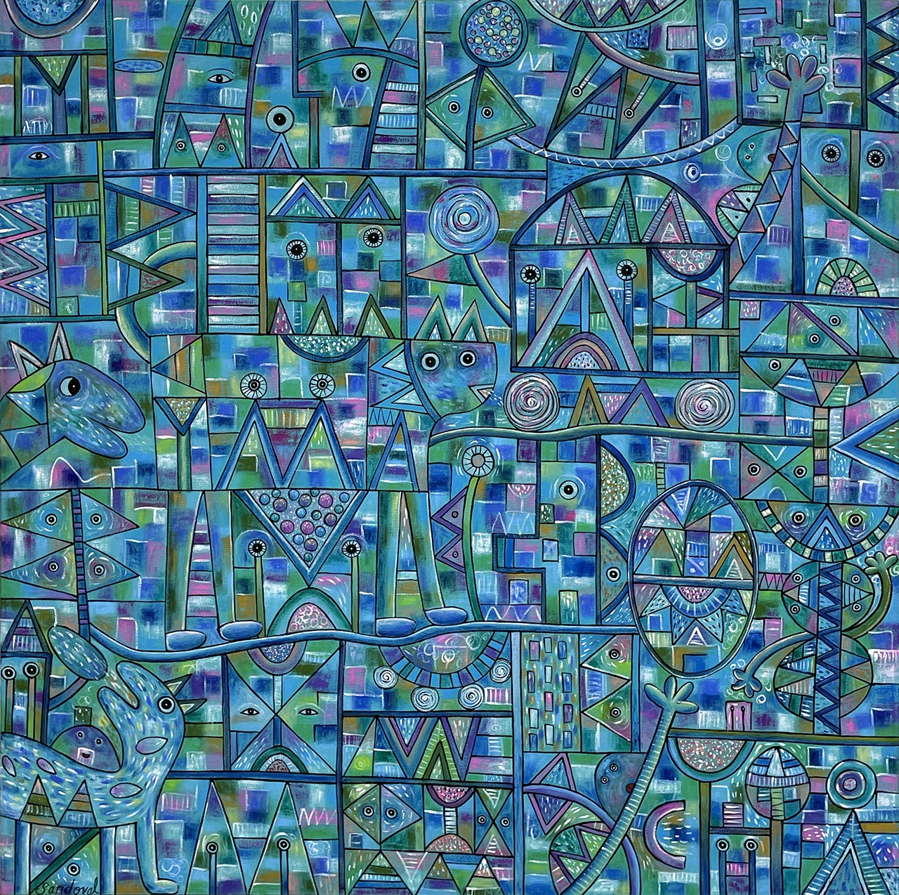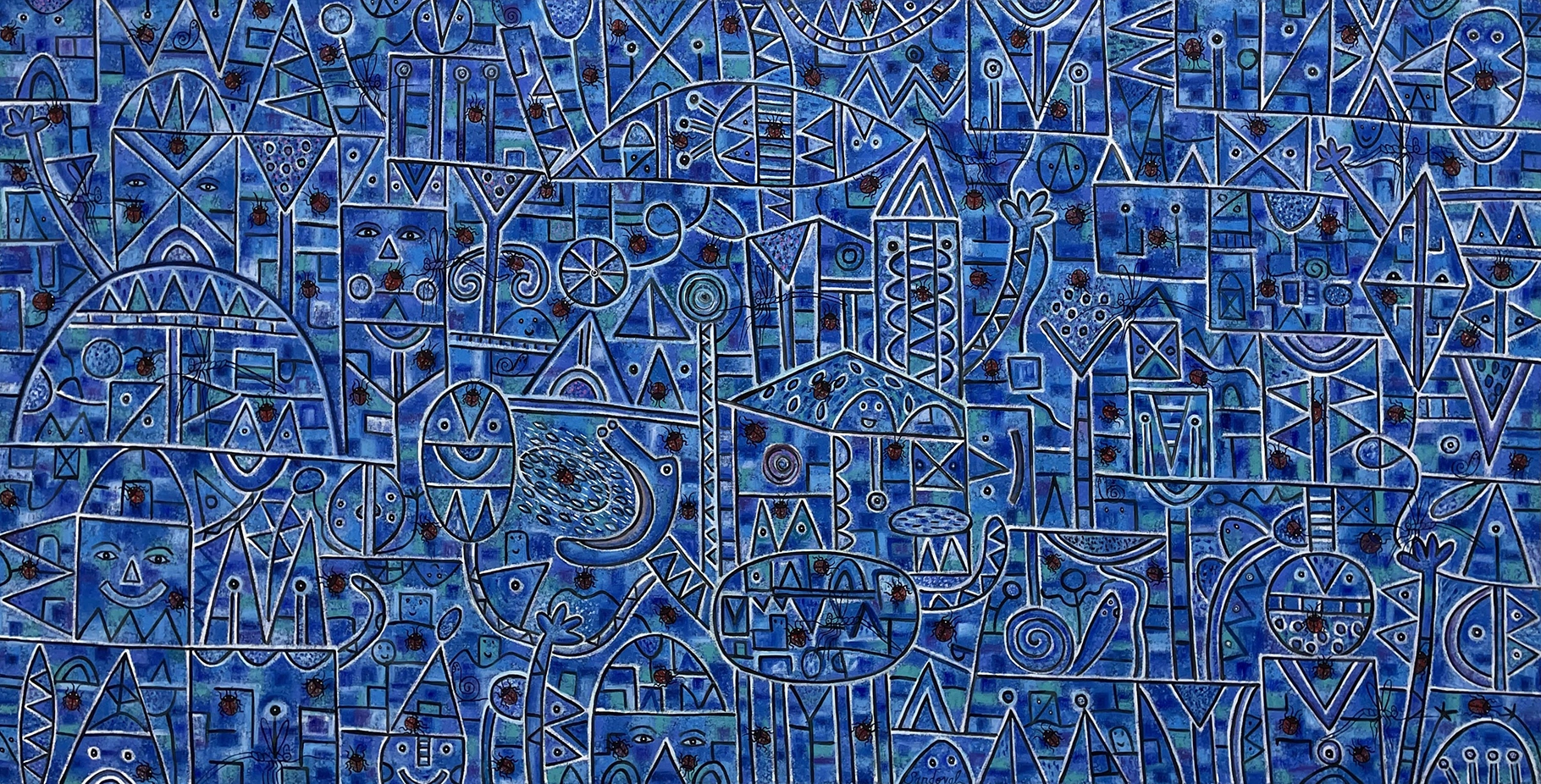 Mediante caminos intrincados, líneas curvas y rectas llenas de color, emergen seres fantásticos que llenan de alegres notas la composición. Cada pincelada es un acento más en su obra.
