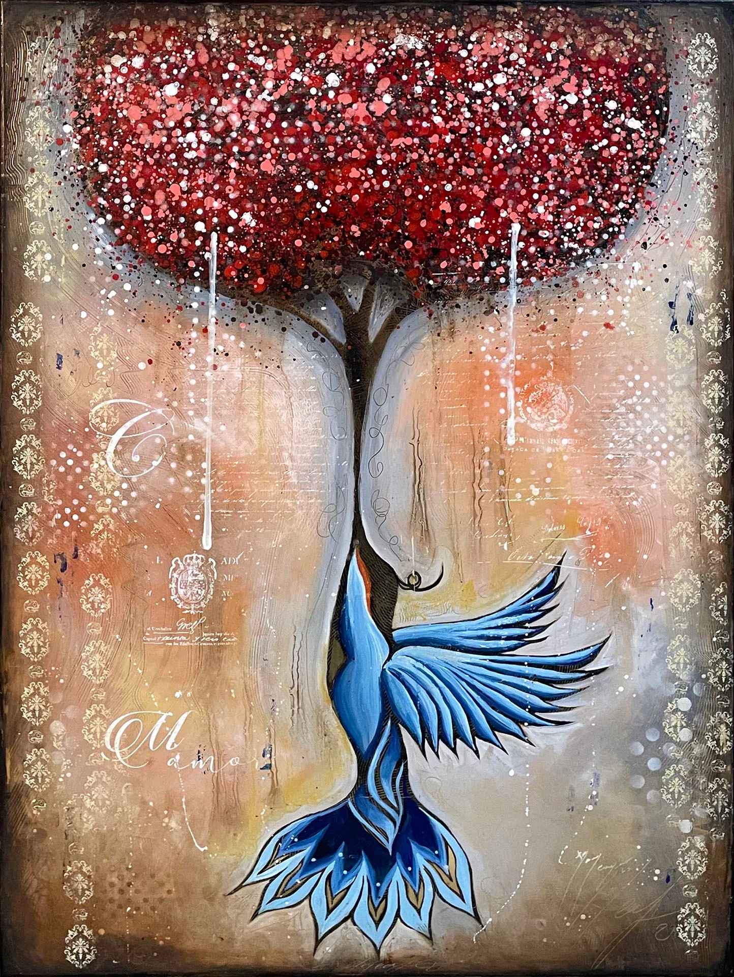Aves, insectos y animales bicornes protagonizan los paisajes fantásticos de Mario Carrizosa, donde dominan grandes árboles de frondas rojas o azules, así como diseños geométricos que recuerdan símbolos esotéricos. Una evocación de seres y hogares nómadas.